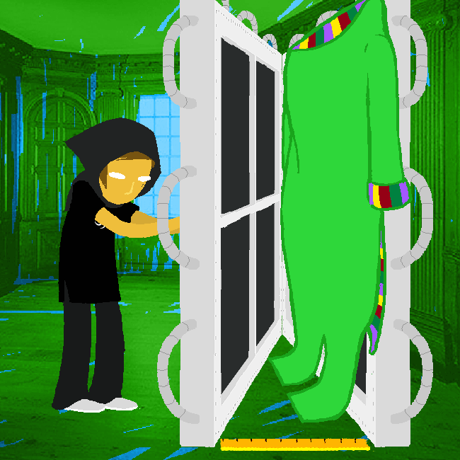 Their entry into the apartment is noticed by Hussie in his super-fast Hussiebot form, and he immediately rushes over to the Yard to begin his interference. He considers killing John and Jade off and ruining the story, but lacks enough time to do something that drastic and opts to level them up instead. The two would eventually notice Hussiebot, prompting him to throw a green curtain over the wall setup to prevent any further interaction with them.